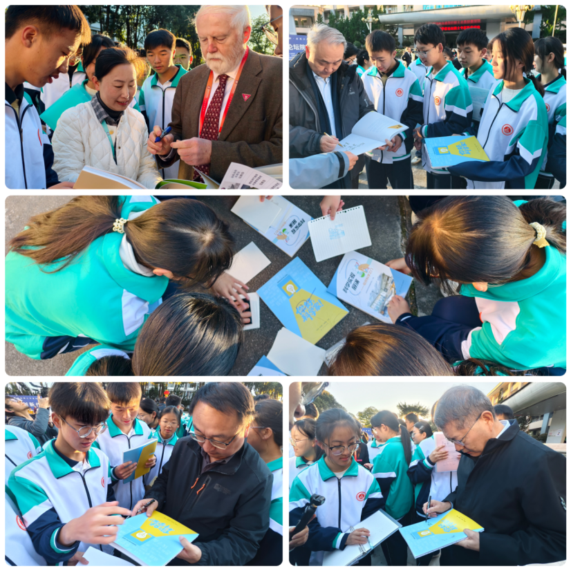 在腾冲一中的活动现场,学生手捧《你好,科学家!》,争相请院士签名合影,并在“我的科学家梦想”留言墙上写下“我要发明抗癌新药”“我要做像冯晶老师那样的人”等真挚感言。